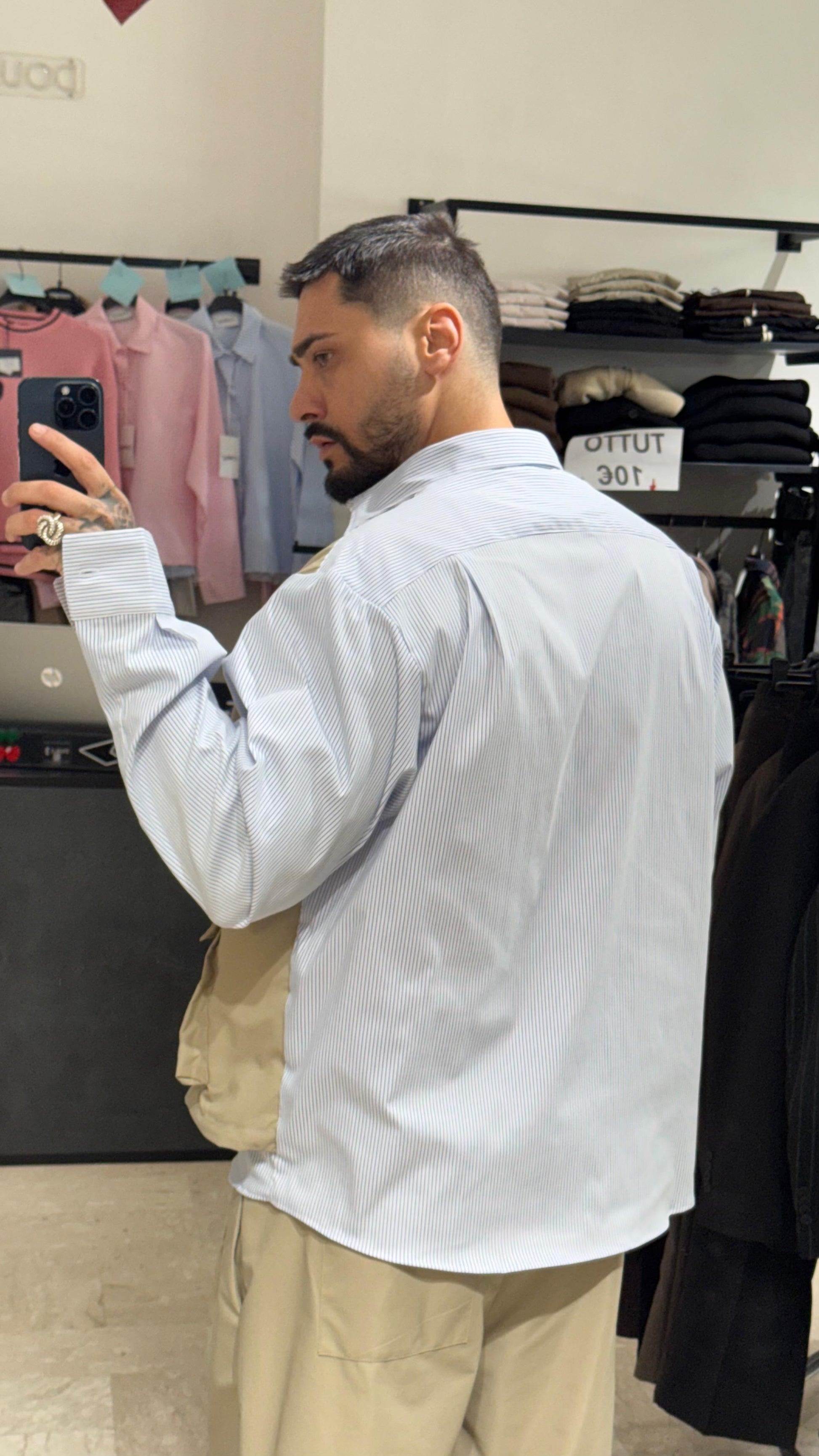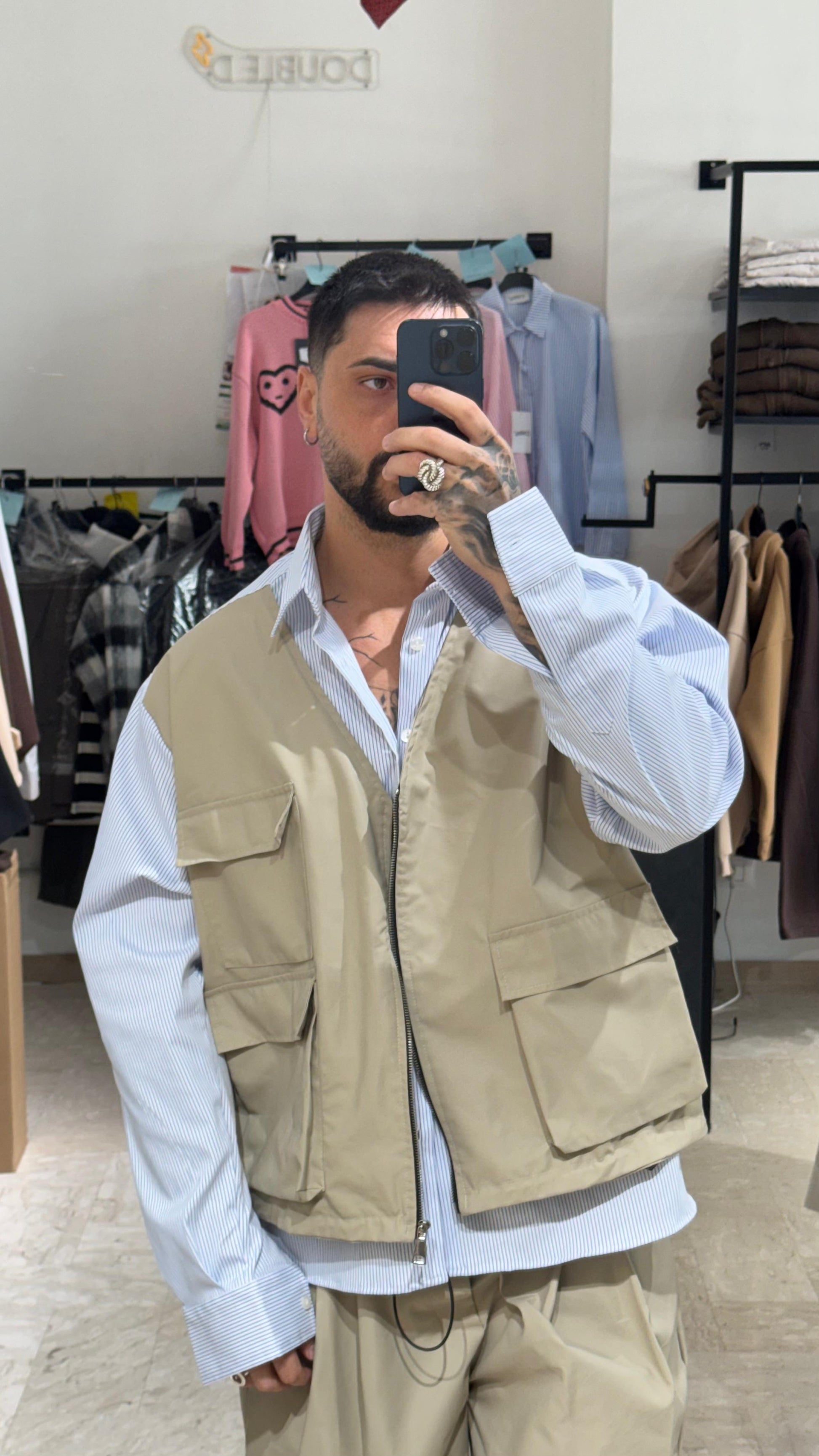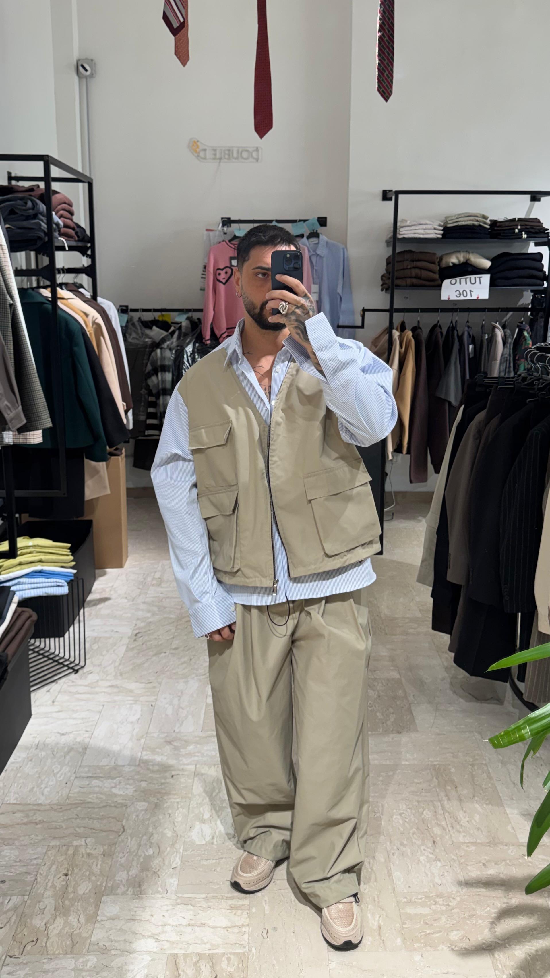 COMPOSTO DA UNA CAMICIA OVER CON GILET INTEGRATO,PANTALONE FONDO LARGO CON COULISSE SUL FONDO REGOLABILE